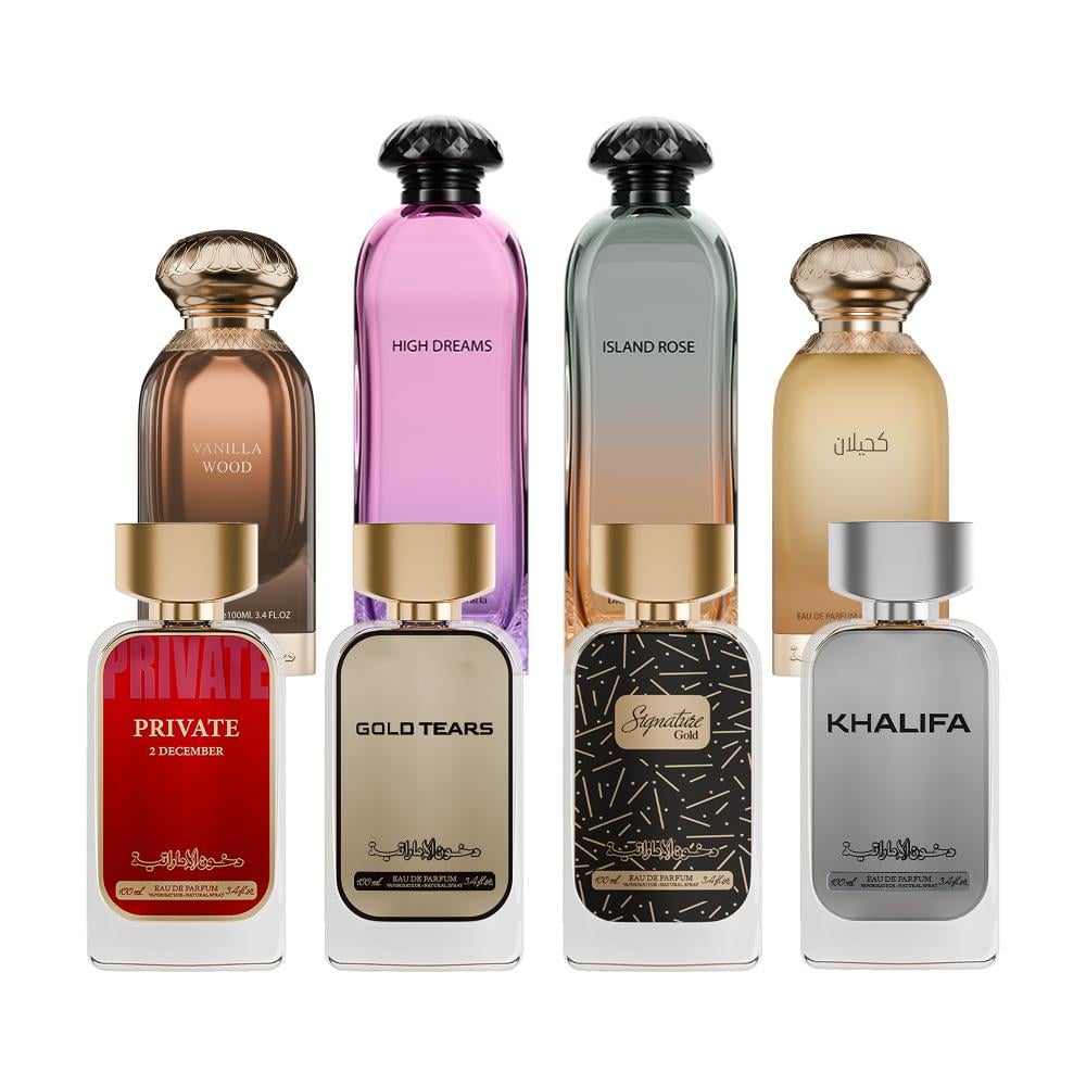 تنوع العطور: تشمل الباقة عطورًا تناسب جميع الأذواق والمناسبات، مع مزيج من الروائح الشرقية والفخمة.