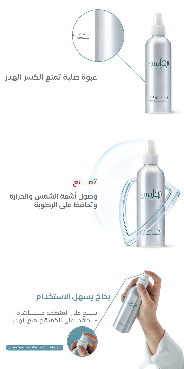 زيت محاسن هو المنتج المثالي لجميع أنواع الشعر بتركيبته الطبيعية 100%، التي تضم أفضل الزيوت الطبيعية. يساعد زيت محاسن في تحسين صحة الشعر وزيادة كثافته، ويعمل على تحفيز نمو الشعر بشكل فعال ويعالج مشاكل الشعر الشائعة مثل التساقط والقشرة. زيت محاسن هو الخيار الأمثل للعناية بالشعر ويمنحكِ شعرًا لامعًا وصحيًا.